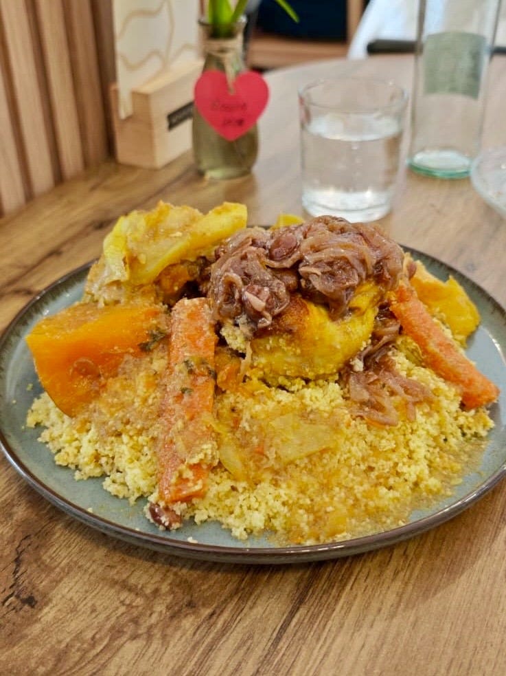 También se puede probar su tajín de cordero con ciruelas negras y almendras, el pollo con cebolla caramelizada o la ensalada de berenjena hecha como antiguamente. Porque ella también defiende lo tradicional sin complejos.